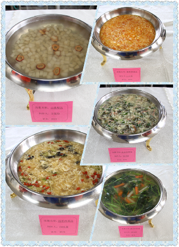 参赛人员根据幼儿年龄特点自己配料并创作出新颖的汤羹。比赛前,参赛人员都做了精心的准备,30分钟比拼,10位选手分别用准备的食材做出了猕猴桃百香果汁、蔬菜南瓜汤、海米萝卜丝汤、迷你小馄饨、山药排骨汤、山楂梨汤、冬瓜羊肉丸汤、香菜鸡蛋汤、翡翠鸡蛋汤、金针菇番茄汤10种。评委们对参赛人制作的汤羹,从色、味、形、创意等方面进行打分,评出一、二等奖。